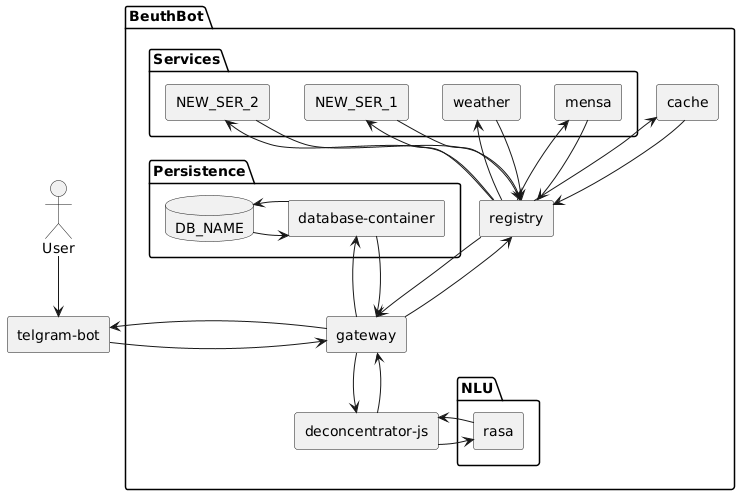 Not even for us this is / was a huge workload before starting development and / or when deploying the project. Facing this problem we started writing bash scripts updating and editing these projects. But in the end that didn't felt right so we decided having a master project (this repository) containing and combing the packages of the BeuthBot and making it possible running the whole system with one `.env` and one `docker-compose.yml` file.
