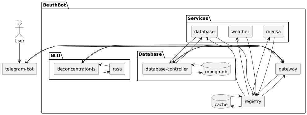 Der Beuthbot besteht aus mehreren ineinandergreifenden Microservices, die über eine umfassende API miteinander kommunizieren. Durch diesen gewählten Ansatz lassen sich jederzeit weitere Microservices integrieren. Die Basis stellen folgende 4 Komponenten dar:
