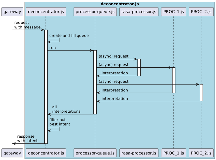 For every incoming message the deconcentrator creates a new `ProcessorQueue` (defined in `processor-queue.js`) and adds all available processors to it. When calling the `.interpretate(message)` function of the queue it starts requesting the processors for an interpretation. The number of asynchronous requests can be set with the `numOfSynchronProcessors` property of the queue.